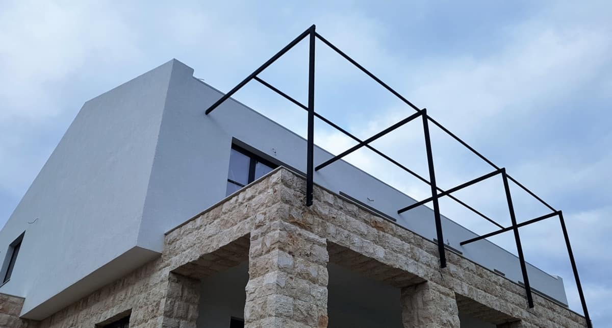 - Плосък покрив с 15 см XPS, с три слоя хидроизолационна система от TechnoNICOL, скатния покрив е вентилиран, с пластифицирана ламарина – цвят по RAL 7043 . Дебелина на топлоизолацията на скатния покрив е 25 см каменна вата – Multirock и Knauf